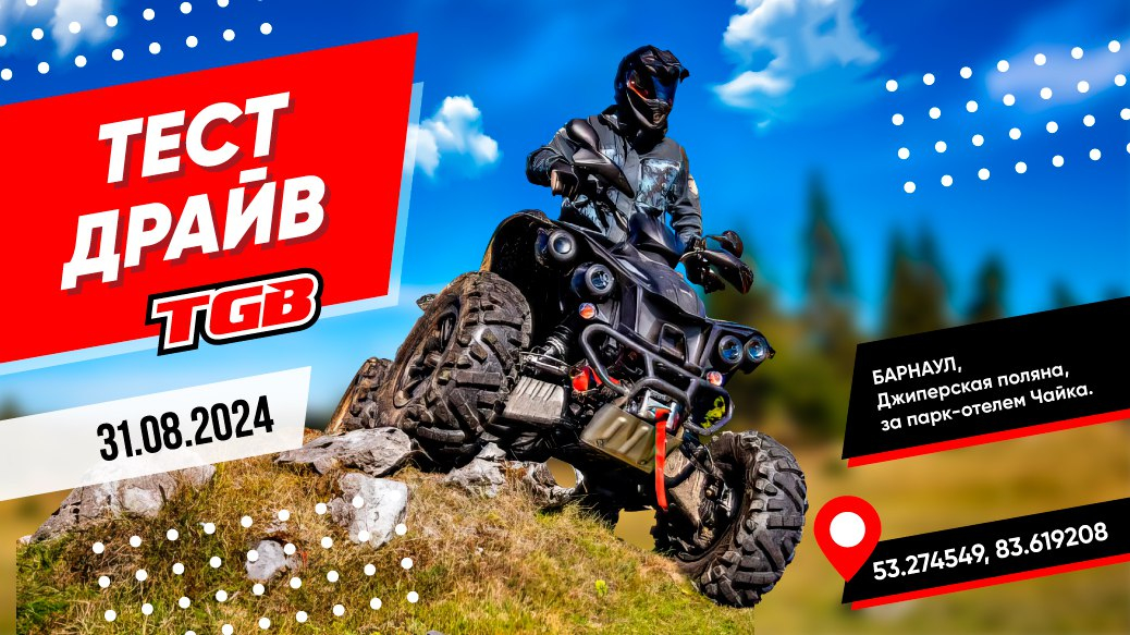Официальный дилер TGB в Барнауле квадросалон «Мотопульс» совместно с дистрибьютором компанией BRANDT приглашает вас принять участие в тестовом заезде премиальных квадроциклов, который состоится 31 августа на джиперской поляне недалеко от города.